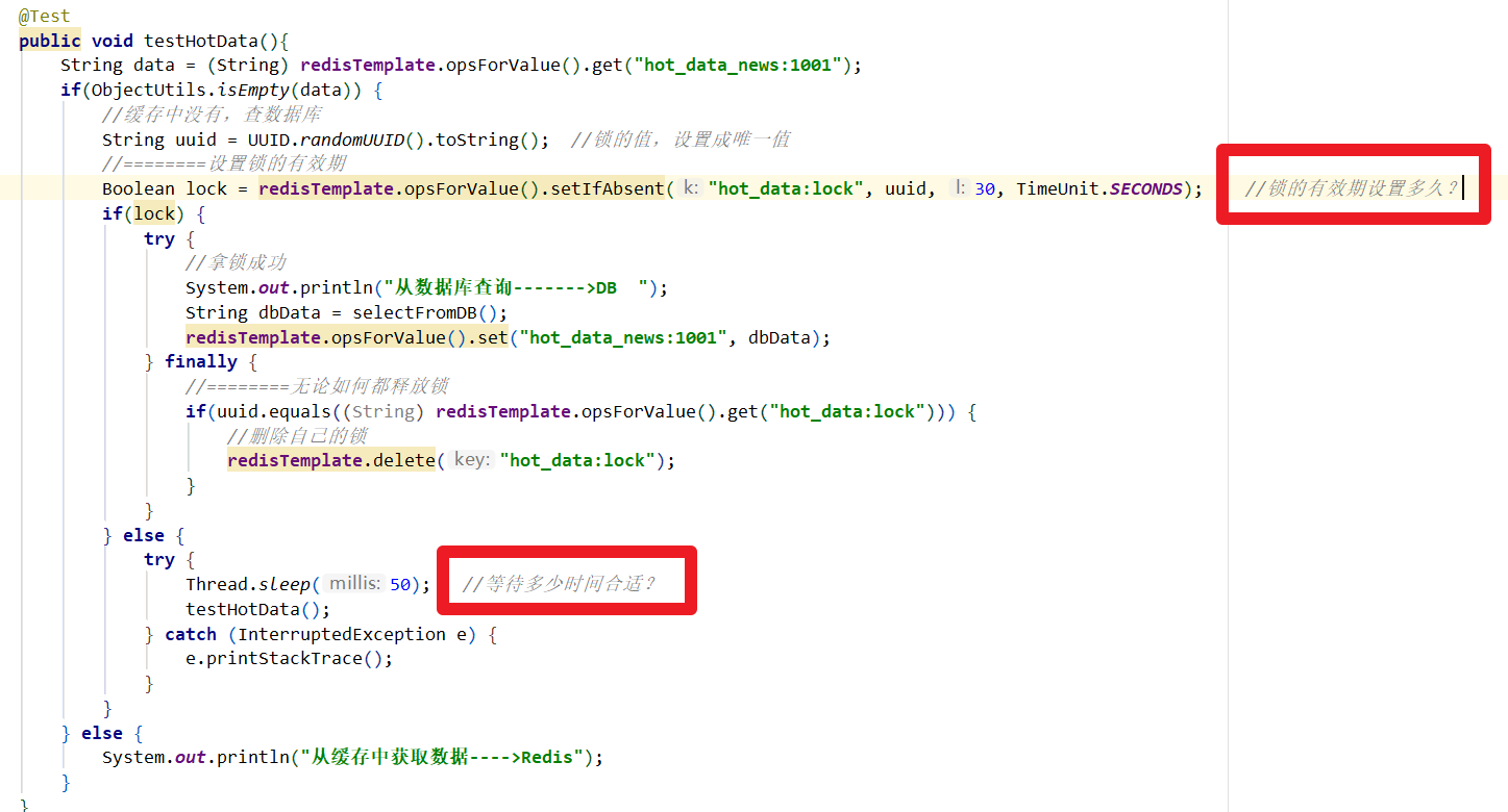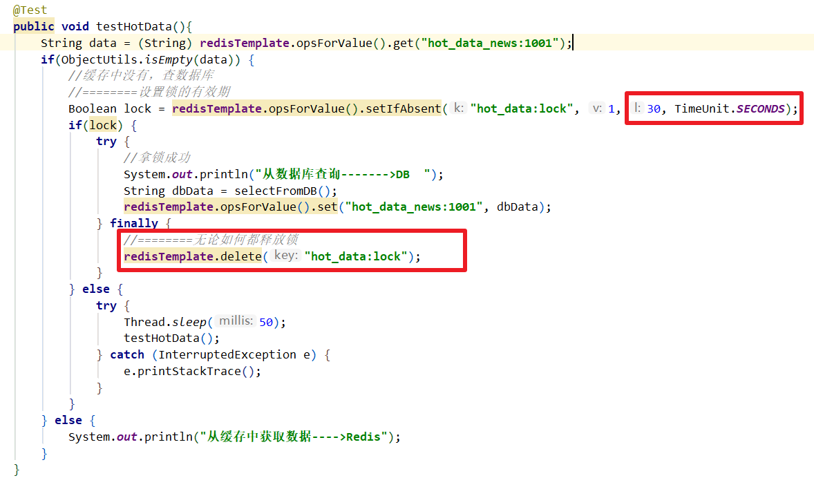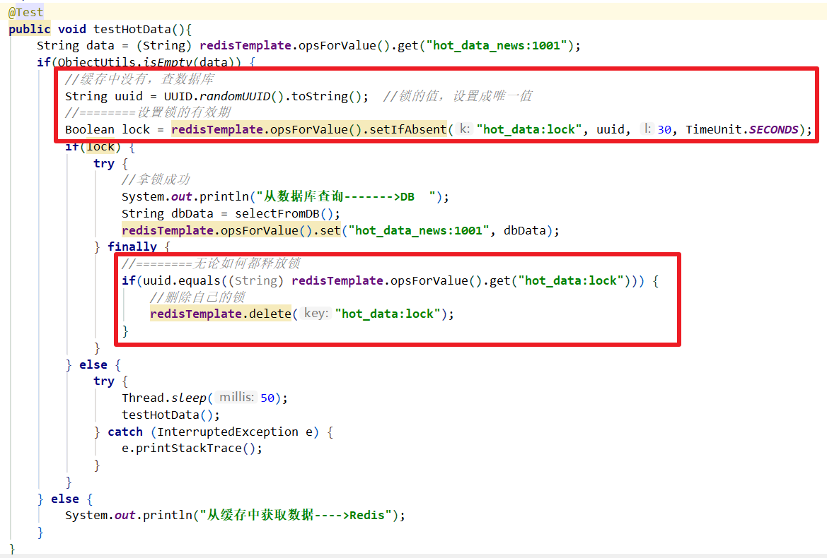 Boolean lock = redisTemplate.opsForValue().setIfAbsent("hot_data:lock", 1);